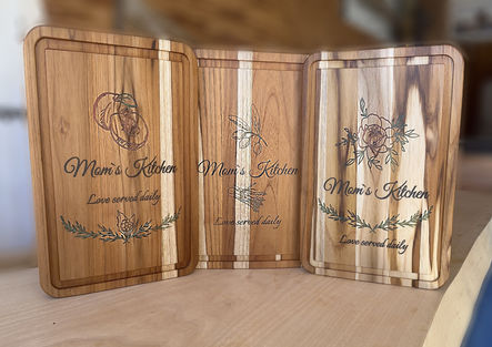 Custom engraved teak wood cutting boards. Design engraved with CNC machine and filled with epoxy resin. Cutting board has juice groove and handle on the back of board